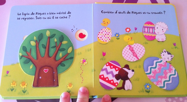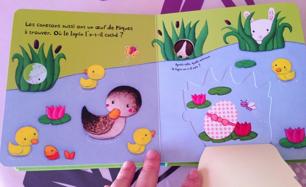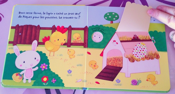 C’est un livre avec des rabats à soulever pour découvrir où le lapin de Pâques a bien pu cacher les oeufs pour les autres animaux.